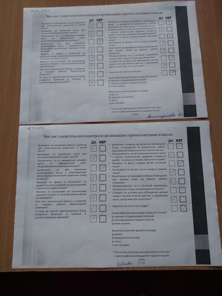 18.03.2022 прошел День открытых дверей по контролю организации горячего питания в школе. Родители дали высокую оценку качества школьного питания, ознакомились с документацией, подтверждающей качество и безопасность еды, оставили положительный отзыв, заполнили чек- лист и опубликовали в социальных сетях.
