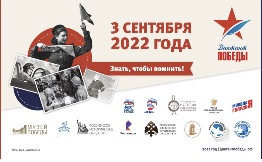 3 сентября 2022 года по всей России пройдёт акция «Диктант Победы»- исторический диктант на тему событий Великой Отечественной войны. Диктант можно будет написать онлайн или на одной из более, чем тринадцати тысяч площадок.