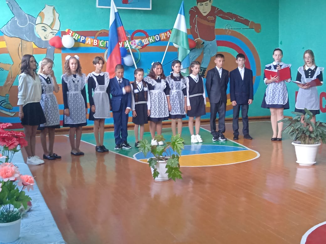 Традиционно в этот день в нашей школе прошла торжественная линейка. Она началась с поднятия государственного флага Российской Федерации и Республики Башкортостан, исполнения государственного гимна нашей страны и Республики. Также были возложены цветы к памятнику участникам Великой отечественной войны.